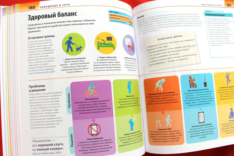 Вся эта серия книг издана в виде инфографики - это самый лучший способ понять и усвоить информацию. Это схемы, короткие блоки информации, стрелки, картинки, сноски на полях. Написано понятно и по-человечески. Книгу лучше прочитать родителям, а после, при возникновении вопросов, можно прямо по главе давать в руки ребенку.