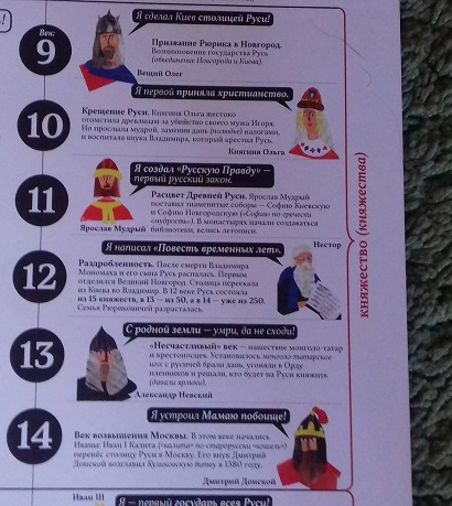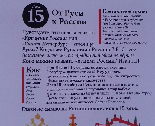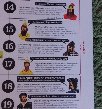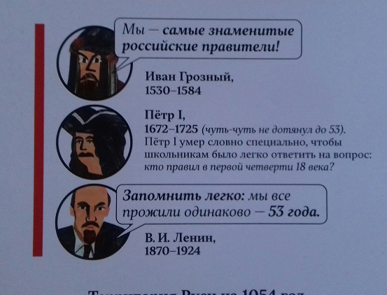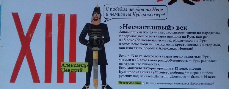 А также, я бы сказала, смелое утверждение: "Чтобы ориентироваться в нашей истории, нужно запомнить всего четыре века: 10, 13, 16, 18. И, в общем-то, автор это доказывает, строя все события русской истории именно вокруг этих веков и давая советы, как лучше их запомнить (по ассоциации с чем-то):