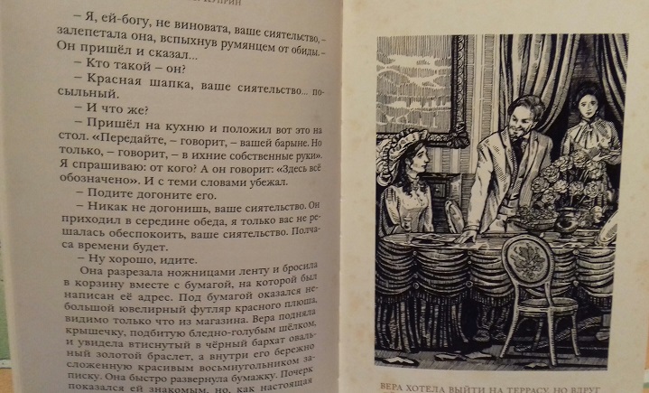 А.Куприн. "Гранатовый браслет" от ИДМ. Около 100 страниц текста, прекрасные, на мой взгляд, иллюстрации М.Шестакова. Их не очень много, где-то по 1 на каждые 10-12 страниц.