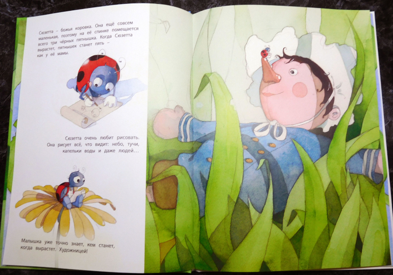 Сюжет этой книги не оригинален: потерявшийся ребёнок ищет маму. Известный бельгийский автор и художник Квентин Гребан отправил на поиски мамы маленькую божью коровку Сюзетту, которая очень любит рисовать. У автора получилась поучительная история с линейным сюжетом: божья коровка так увлеклась рисованием, что сама не заметила, как ушла далеко от дома.Справившись с испугом, она придумала, как отыскать маму - нужно нарисовать её портрет и показать его окружающим. Возможно, кто-нибудь вспомнит её маму...