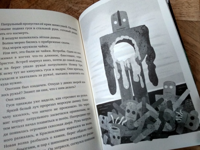 Мне очень понравился язык - спасибо автору и переводчику. Простой, понятный, без вычурности, и в то же время не примитивный. Очень доступный ребенку. Вообще книга такая семейная - ее хорошо читать всем вместе в спокойной обстановке. И для самостоятельного чтения в младших классах тоже хороша. Удачная компоновка, психологически поддерживающая юного читателя комфортным шрифтом и интервалом, разбивкой глав, их обязательным началом на следующей странице, размером заголовков и количеством небольших и полностраничных иллюстраций, хоть и неброских черно-белых. И вроде бы я от них не в восторге, но они так органично вписаны в книгу, так отлично дополняют текст, располагаясь строго по сюжету и смыслу, что я опять-таки могу только аплодировать автору - Питеру Брауну!