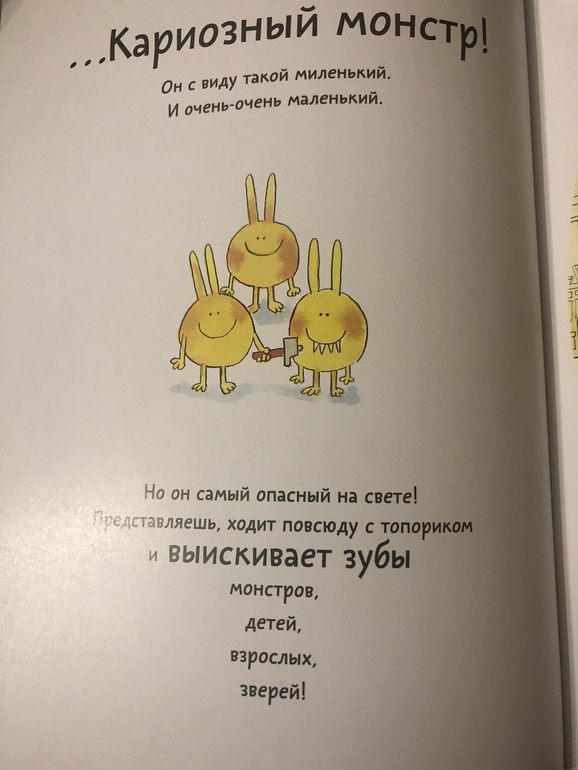 У нас такое первый раз, ребёнок изо дня в день приносит одну и туже книгу. Мы ее читаем, перечитываем и ещё раз читаем. Книга ,, Чистят ли зубы монстры? Изд Вилли Винки. Книга оказалась полезной и она действительно работает. Вечером дети часто ленятся чисть зубы, но как только открываем эту книгу - Та -дам! Бегут в ванную и наперегонки чистят зубы, а потом младший показывает и говорит: ,, Мама, я всех кариозных монстров прогнал, посмотри! Очень доступно написано, о том, что нужно ухаживать за зубами, что врач стоматолог - это хорошо и его не надо бояться.