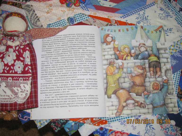 Удивительно, как много смысла бывает заложено в простых вещах. И если вам интересны давние традиции предков, у вас есть желание рассказать о них своим деткам, возьмите книгу Марии Евсеевой "Широкая Масленица. Солнышко на тарелке". Главные герои книги - детишки детсадовской группы - получают ответы на вопросы о праздновании масленичной недели. Красочные иллюстрации образно дополняют сюжет книги.