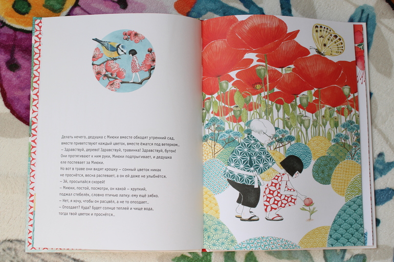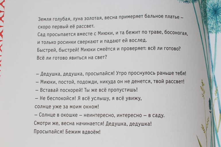 Внимание! Книга на 100% пропитана весной😉. Главными действующими лицами книги являются девочка Миюки и её милый дедушка. Проснувшись, Миюки понимает, что наступила весна. Она бежит в сад, чтобы не пропустить пробуждение природы, и находит ослабший цветок. Миюки хочет помочь ему набрать силу и будет всю книгу бегать в поисках воды.