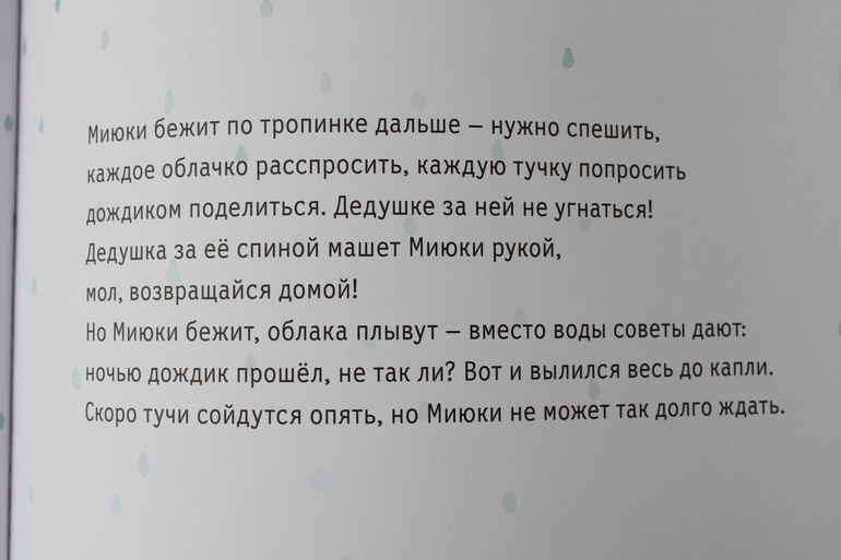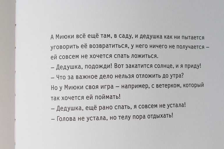 Запомните этот текст, он нам еще пригодится. Это первый абзац в книге. Где же Миюки? Миюки никак не хочет ложиться спать. Дедушка будет на всех страницах пытаться её уложить. Но у девочки тотчас будут находиться новые непеределанные дела. То огород полить...