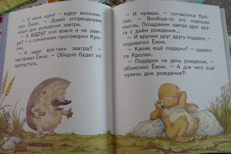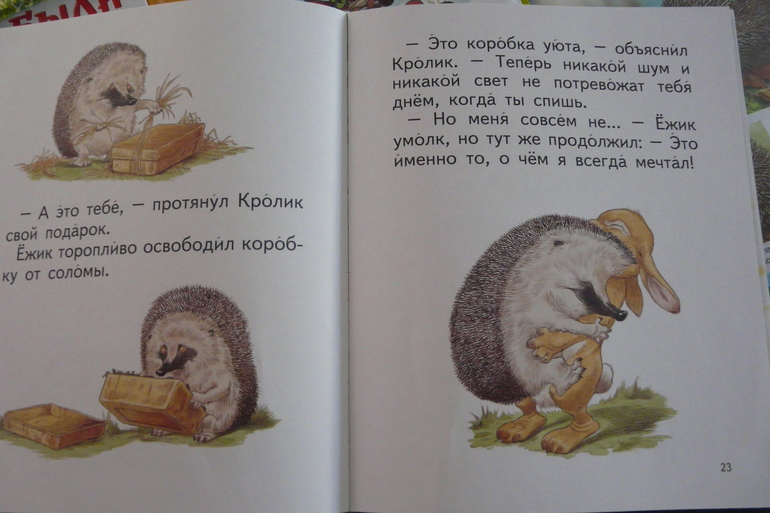 "Сказки о ёжики и кролике" нежно любим.Трогательные истории о дружбе.Иллюстрации специфические:) особенно ежик:(. Но все равно книгу всегда рекомендую.Отличный крупный шрифт и добрые истории