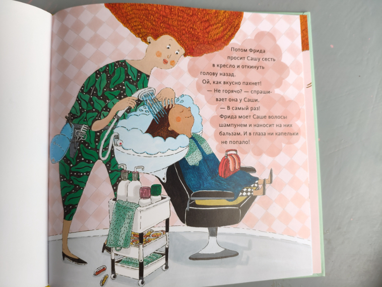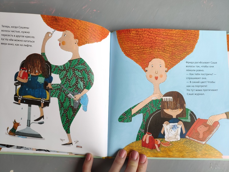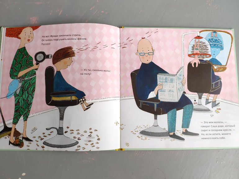 Иллюстрации в книге очень классные. Саша очаровательная, ее мама такая настоящая, а Фрида-парикмахер колоритная. В книге есть юмор! Можно с самого начала похихикать, как Саша за челкой не нашла даже своего любимого кролика, очень смеется дочка на моменте, когда отстриженные волосики Саши прилетают на голову лысому дяде. И Саша говорит: «Это мои волосы, но, если хотите, можете немного взять себе».