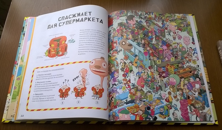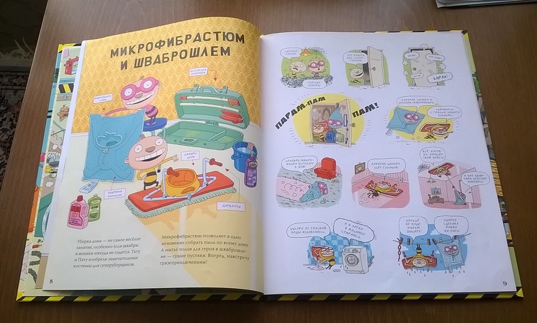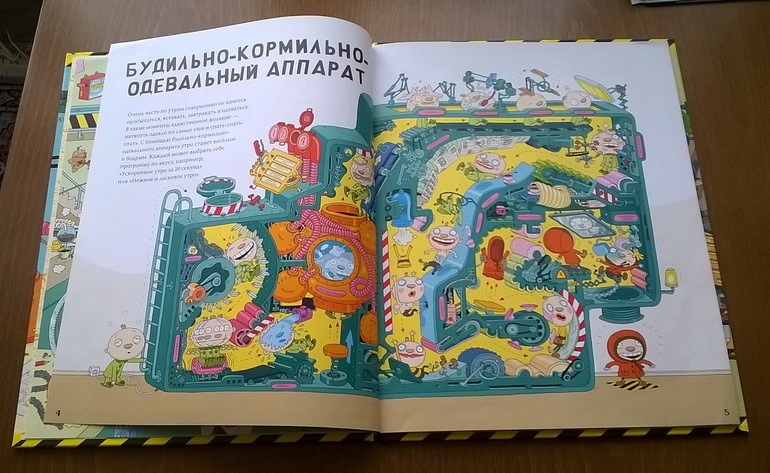 Книга приятно удивила. Во-первых, в ней много деталей, а ребенок и в шесть лет, оказывается, любит разглядывать, не только в два-три (виммельбухи были в большом почёте). Во-вторых, она смешная. Когда я притащила домой заказ, Даша вытащила книгу и удалилась с ней в комнату, после чего с полчаса ребёнка не было не видно и не слышно (уже и не помню, когда это последний раз было). Сидела на кровати и прилежно читала и изучала. Потом позвала меня и попросила прочитать вслух. Когда читали и разглядывали вдвоем, Даша показывала мне, как там всё устроено («Вот, смотри, вот так они садятся, вот так едут и - чик!... А вот так…» В общем, море эмоций), а я упивалась языком, ибо книга - это фактически пародия на нашу жизнь: «Натур продукт», «Халтур-продукт» - вывески в магазине, там же - «Размазня на любой вкус», «Конкурс «Выиграй супер-открывашку!» Полы в доме моют Капитан Швабра и Человек Микрофибра (отсыл к мультикам, как я понимаю).