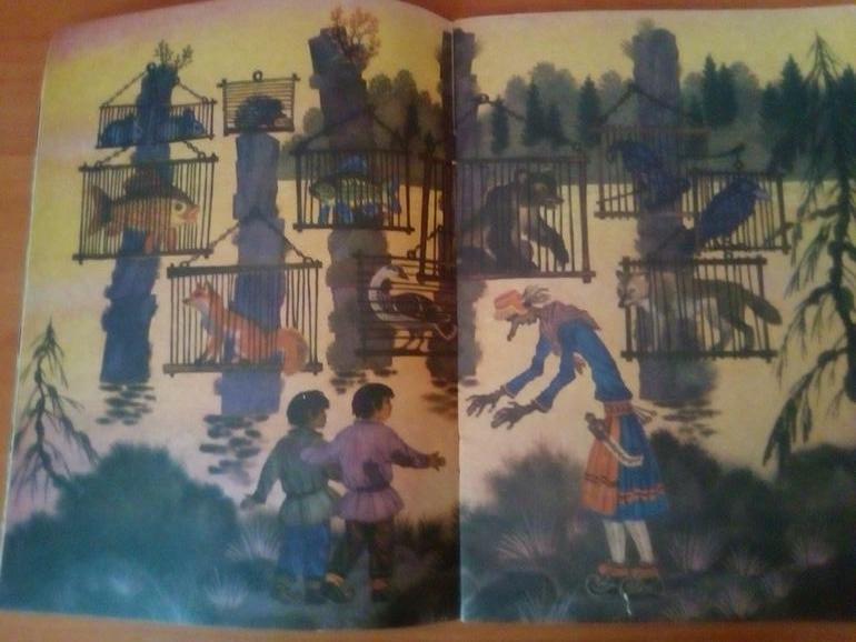 Есть пара "страшненьких" картинок (помню, в детстве я долго разглядывала эту иллюстрацию. На самом деле Сухая Жердина, которая тут изображена - добрая, она спасла мальчиков от ведьмы, многому их научила и вообще потом оказалось, что это заколдованная прекрасная девушка):