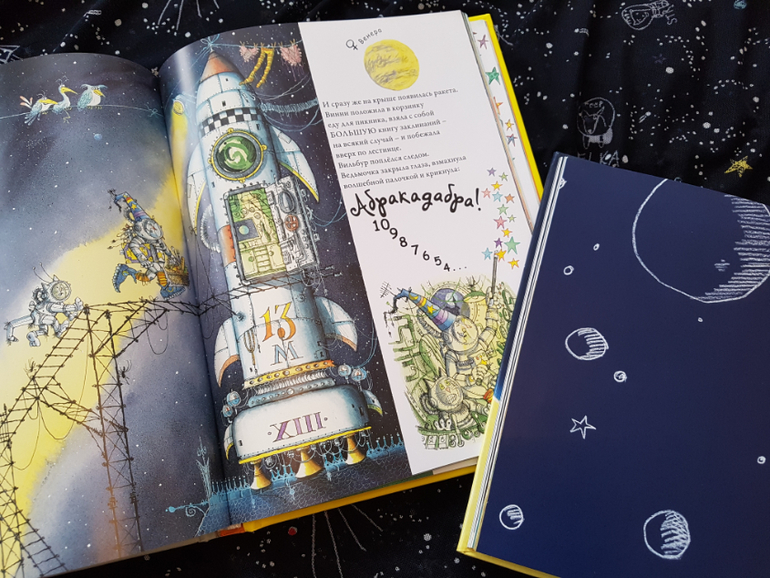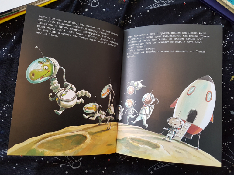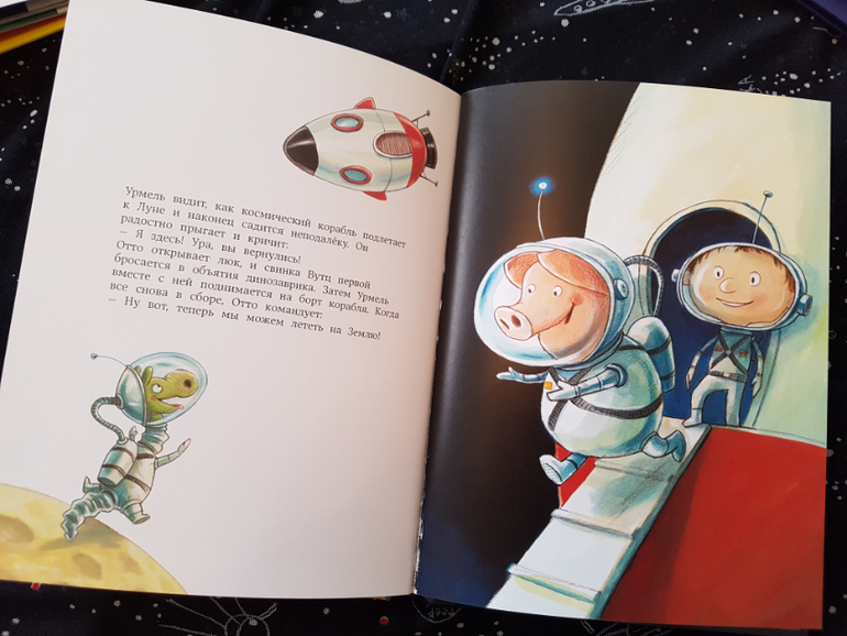 "Урмель летит на Луну" брала в книгообмене, если не ошибаюсь у Оли https://www.babyblog.ru/user/lenta/id2213345. К приобретению никогда её не планировала, но взяла как раз для тематического настроения. Простенькая, детская история, в духе современных детских изданий. Яркие картинки, текст, не обремененный сложным сюжетом. Ильдару нравится космическое направление истории, тем более ещё и с динозавром)). Вот свинью в скафандре то я забыла показать во время поросячьего флешмоба))).