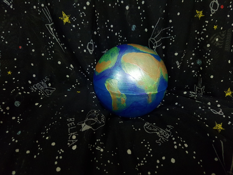 Мы с Ильдаром плавно с темы космоса перешли на тему Земля и сотворили из пластикового шара нашу планету)