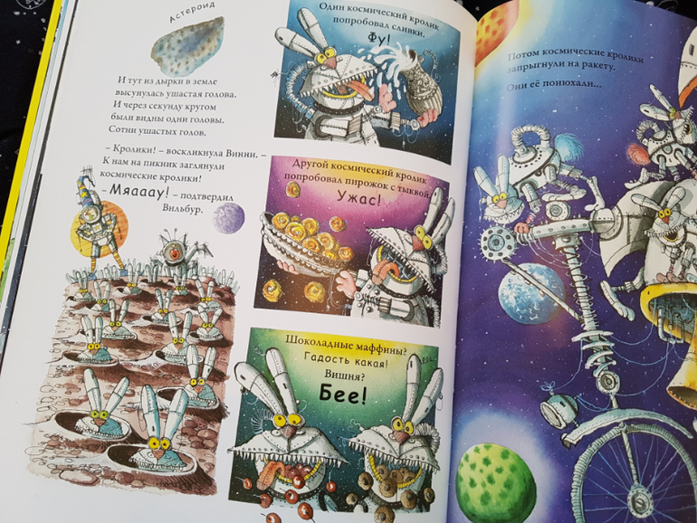 Известная ведьмочка Винни побывала везде, в том числе и в космосе, где голодные космические кролики сгрызли ракету Винни и Вильбура. Хорошо, что колдовская сила ведьмочки не потеряла свою силу и в космосе и наши герои благополучно вернулись домой).