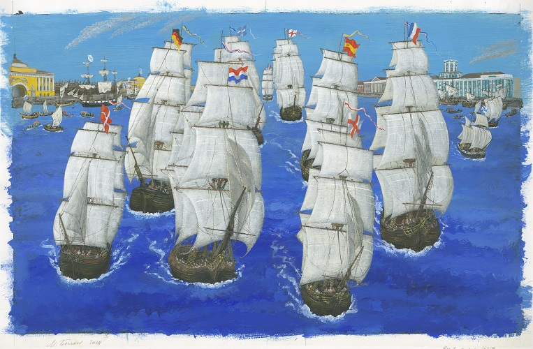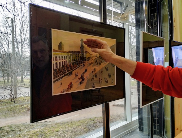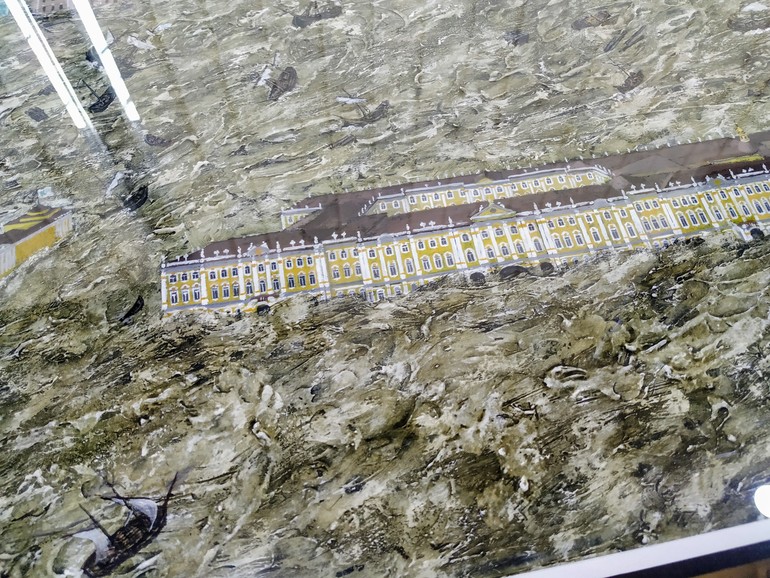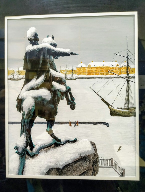 К слову, Зимний дворец изображён не в привычном бирюзовом цвете не потому, что так захотел художник. Тогда дворец был окрашен именно в этот цвет.