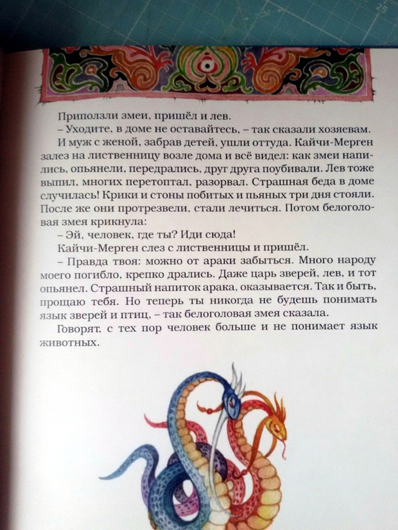 Далее автор описывает странную сцену о том, как отец-мышка потонул на глазах мышки-жены в сметане, она горевала, бегая по крынке и причитая, а Кайчи-Мерген сидел и смеялся происходящему. Я не ребенок, но мышку жалко. Он же змееныша спас, почему мышке не помог? Ладно, и это еще ничего.
