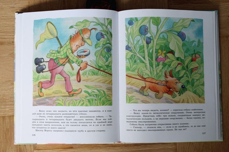 Иллюстрации не на каждом развороте, но их очень много, и они крупные, с большим количеством деталей. Иногда я читаю следующий или предыдущий разворот без текста, а Марго держу картинку.