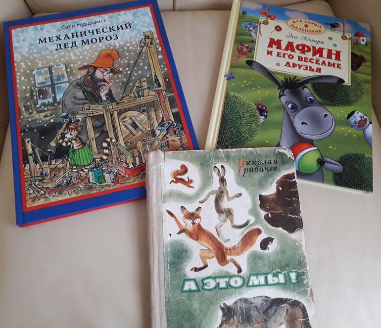 "" сын не дал убрать после зимы. Он у меня истинный фанат старичка и его неугомонного кота. Опять перечитываем, на этот раз выбор пал на новогоднюю. То, что для сына плюс-длинные обстоятельные описания, как Петсон придумывал и собирал свою машину, могут раздражать других читателей. Вполне понимаю тех, кому книга не нравится. Мне она нравится, я от Петсона не устаю. Колеблющимся советую остановится на "Рождестве", а эту книгу изучить по сканам.