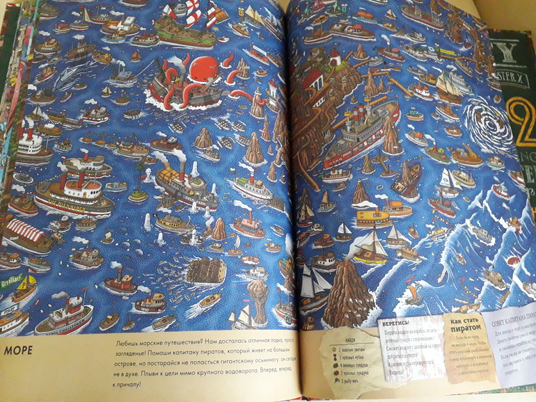 "" удивила своими размерами и обилием нюансов. Книга представляет из себя виммельбух с заданиями на поиск предметов и лабиринтами. Пьер разыскивает таинственного преступника, мистера Х. Он перемещается между локациями (модное слово), читатели-вместе с ним. Каждый новый разворот-новое место.