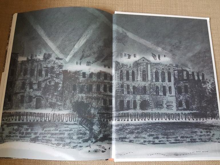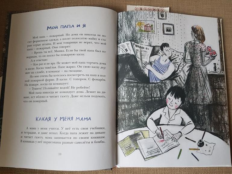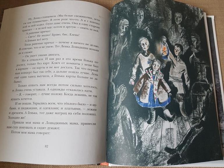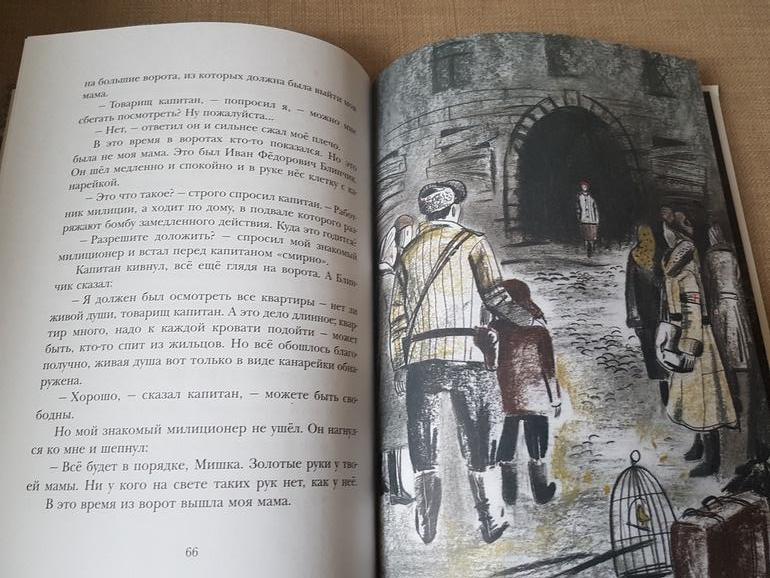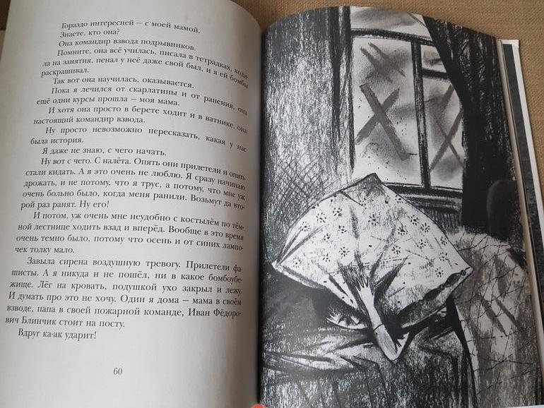 Довоенные события она иллюстрирует в цвете, а войну в серых тонах. Подчёркнуто мрачно. Иногда присутствуют яркие акценты. Приём интересный. Но мне кажется, не очень гармонирует со стилистикой книги. Потому что, несмотря на то, что жизнь Миши резко изменилась, его восприятие происходящего осталось тем же - детским. Часто он описывает события, не осознавая их полностью.