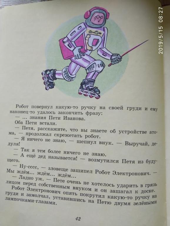 Потом у Пети были и дальнейшие продвижения по ленте истории, попадал и в прошлый век и в будущее, т.е учитывая, что книга написана лет 70 назад, Петя попал в наши дни)), где учителя были уже роботы))