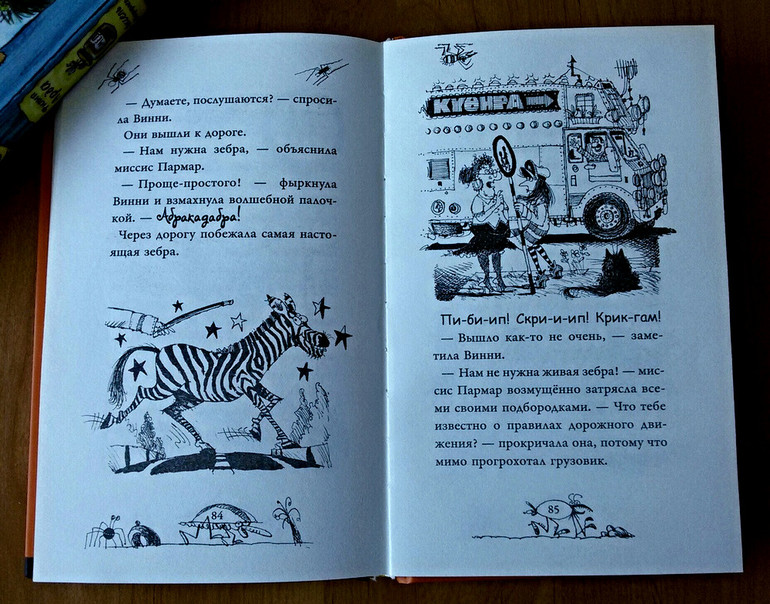В данной книге четыре истории. По объему они небольшие, картинки есть на каждой странице, все они соответствуют тексту. Я понимаю, что подобные книги предназначены для самостоятельного чтения. И рисунки в них специально черно-белые, чтобы не отвлекать и не утомлять детские глаза. Но мы пока читаем их вместе. Во-первых, дочка еще не осилит сразу историю в 30 страниц.Во-вторых, мне самой интересно читать про забавные приключения ведьмочки и ее кота Вилбура. Ведь только ведьмочка Винни может умудриться поссорится с собственной мебелью, назвать школьников обыкновенными нормальностями и превратить дорожный знак в огромный леденец.
