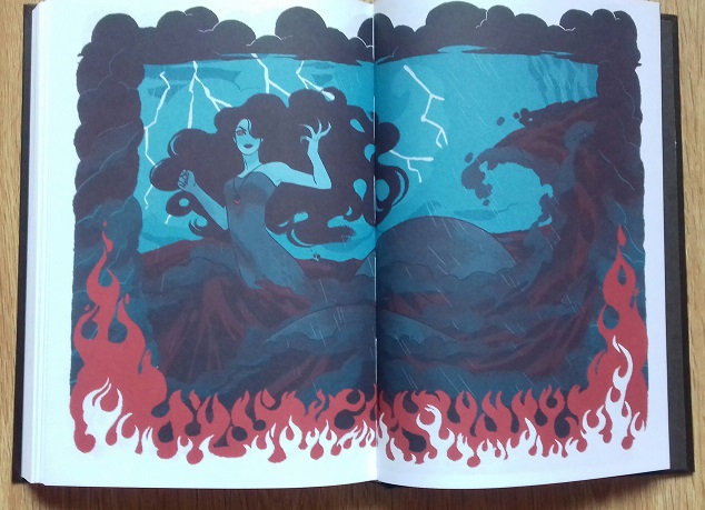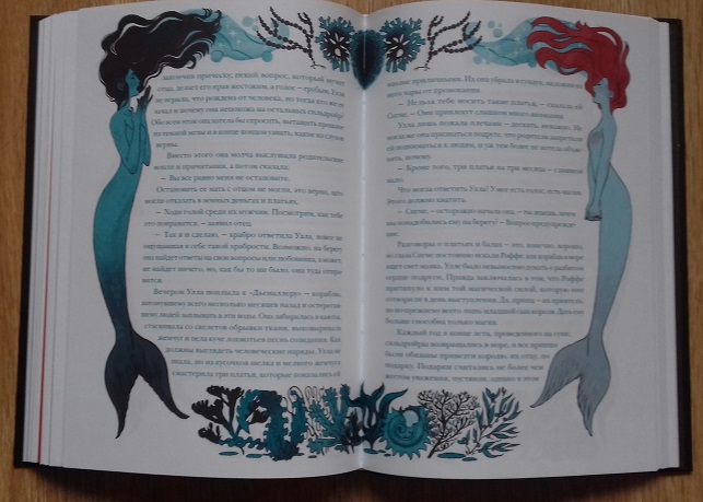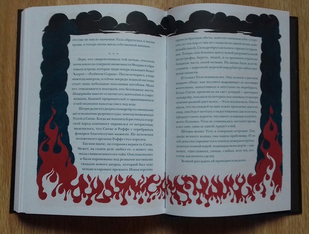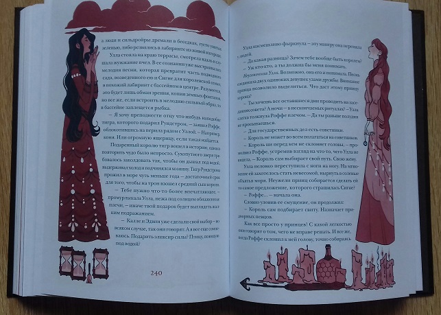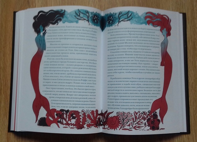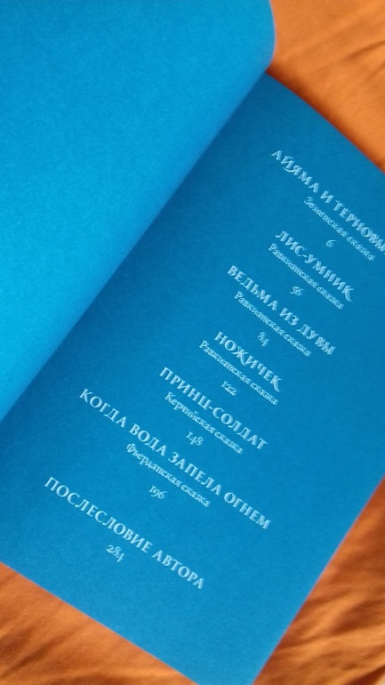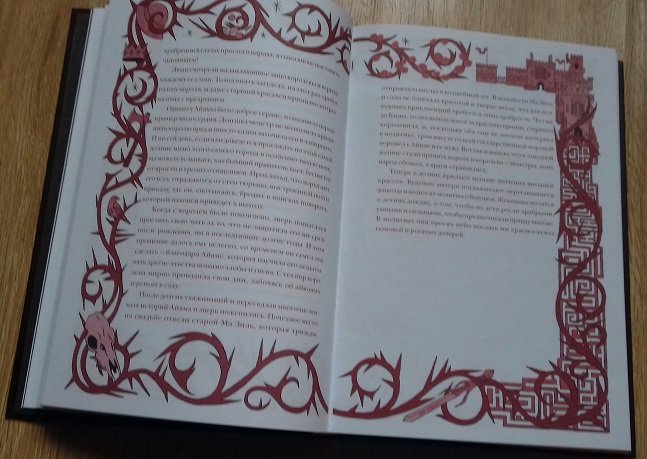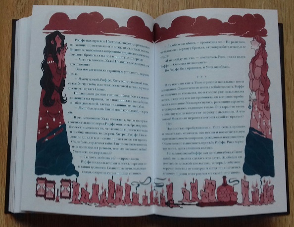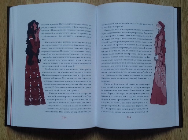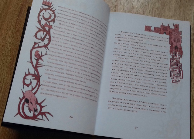 Все иллюстрации выдержаны в розово-сине-черных тонах. И шрифт тоже. Цвет шрифта меняется от сказки к сказке: то малиновый, то синий, по очереди. Не сказать, что это добавляет комфорта при чтении, скорее наоборот. Но атмосферу создает)