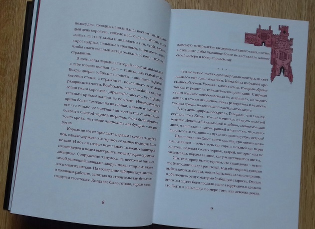 Таким образом получается, что разворотная иллюстрация - одна на сказку. Но в процессе чтения очень интересно видеть всё новые детали, из которых, как будто сплетенное из волшебного пения магов, возникает история. Здесь, в этой сказке, - история чудовища, заточенного в лабиринте дворца, и девушки, ставшей его судьбой. И заметьте, что все вплетенные сюда детали присутствуют в сказке: и череп коня, и кинжал, и шляпа от солнца...