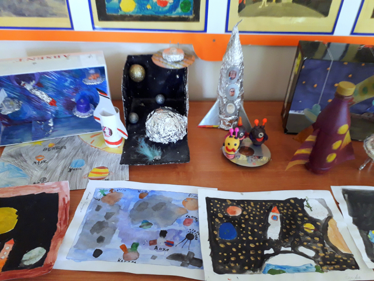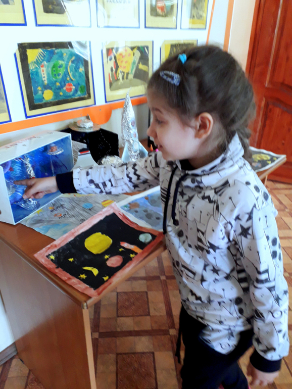 Последний конкурс, видимо, был посвящен Дню космонавтики. Насте понравились работы, она даже загорелась их повторить.))