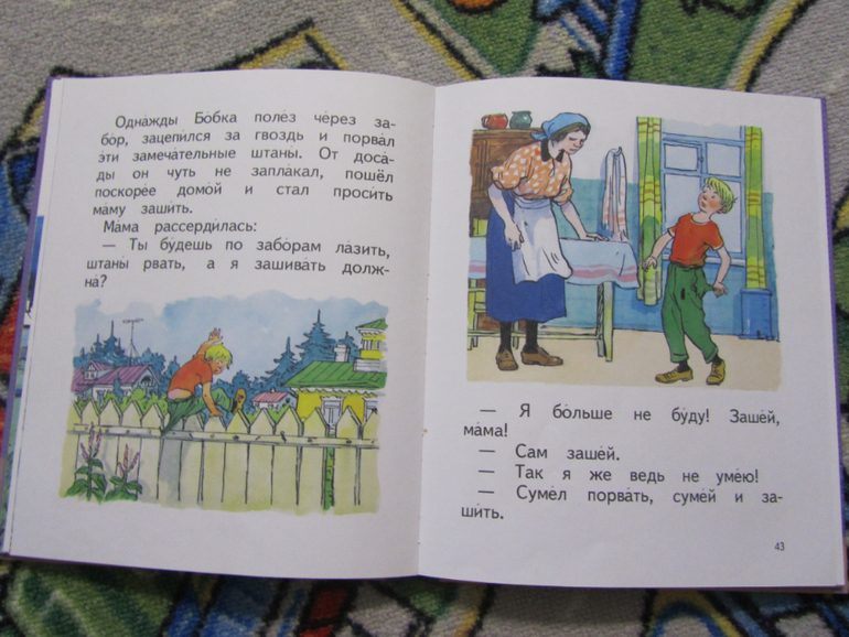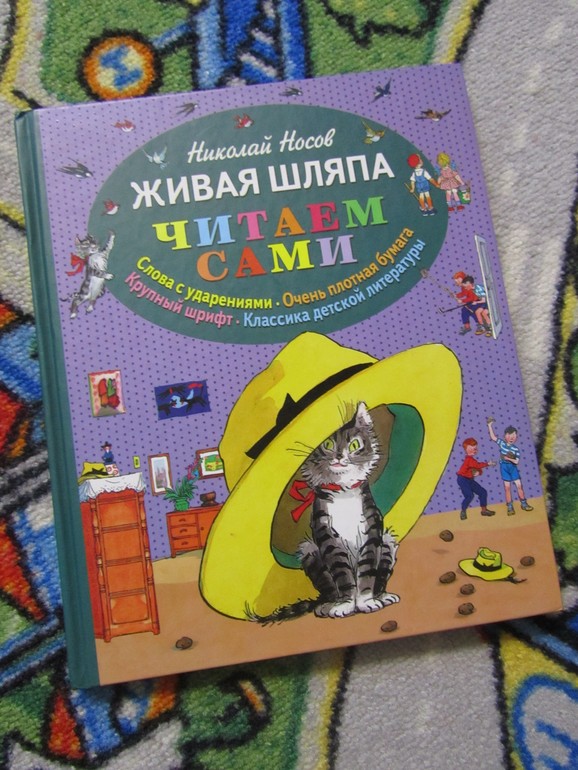 Покупала эту книгу давненько, чтоб потом дети её ещё и самостоятельно читали , вот дождалась)) Рассказы Носова входят в список чтения на лето, поэтому книга пришлась очень кстати. Шрифт действительно довольно крупный с ударениями в словах, что для начинающего читателя просто отличная помощь. В книге всего 7 рассказов, но для первого чтения и знакомства с творчеством Носова самое то)) Плотные офсетные листы, довольно сносное качество иллюстраций любимого Семенова, почему то рассказы Носова ассоциирую только с ним ( ну, ещё разве, что Огородникова воспринимаю ещё). Затейники и Живая шляпа наверное самые весёлые и смешные рассказы, дочке больше всего понравились, в отличие от Огурцов и Заплатки, в которых есть воспитательная нотка. Когда дочке было года четыре я читала эту книгу ей, а теперь она сама может её прочесть, это просто отличная серия получилась у Эксмо , у нас ещё несколько книг из этой серии есть. Теперь сынок дорос до первых рассказов, а потом он сам сможет читать, в общем долгоиграющая книга получилась))