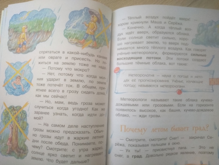 Мне очень понравился раздел в книге про гром и молнию! Родители проводят с детьми увлекательные опыты, объясняя происхождение грома и молнии. А также рассказывают о правилах поведения при грозе - нужно ли бояться грома и молнии и как безопаснее всего вести себя в грозу на природе. Что очень важно и не каждый взрослый об этом помнит и знает!