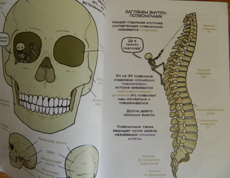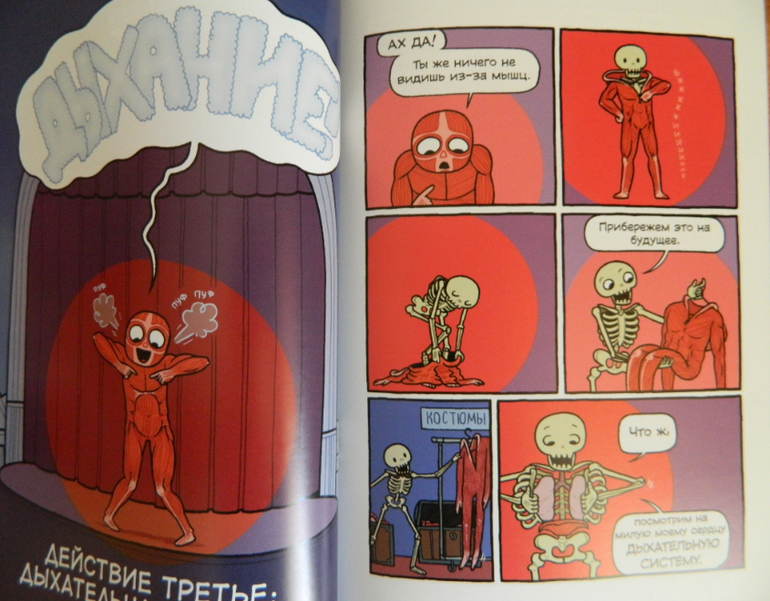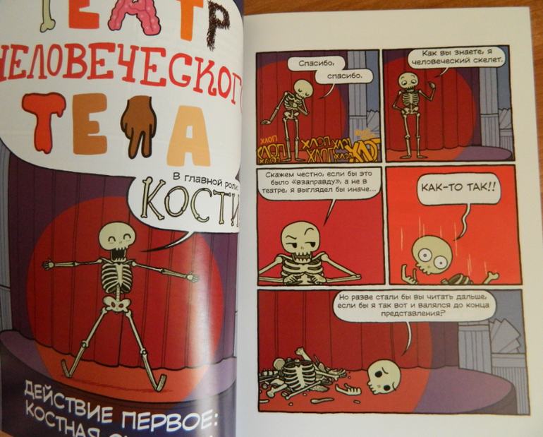 Начну, пожалуй, с "Театра..." Это комикс о теле человека. Выстроен в формате театрального представления, ведущим которого является.... скелет... очень милый, между прочим :)