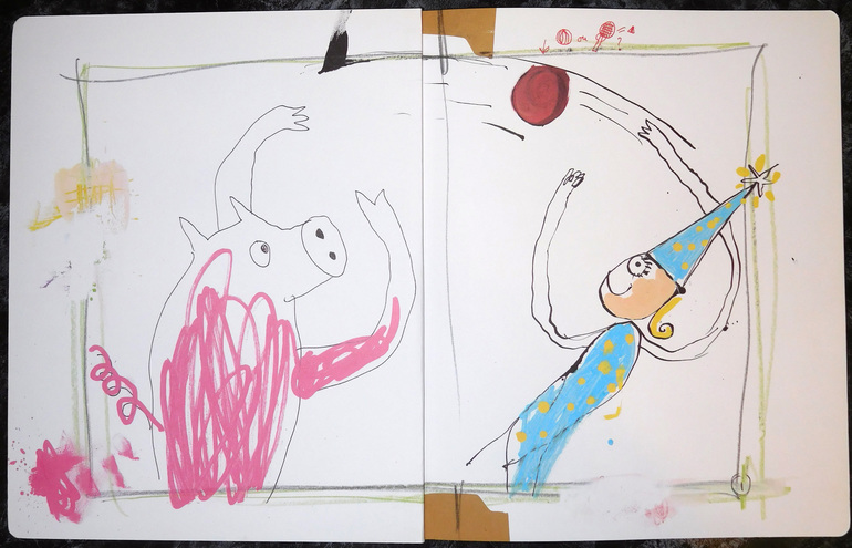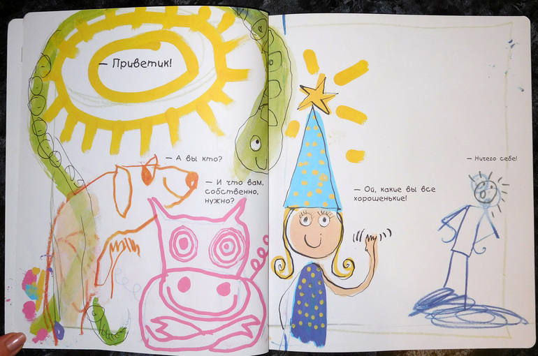 Рисунки в книге забавны, но просты и даже примитивны. Однако, эта простота идёт "в плюс" - ребенок рисует так же, поэтому он примет книгу за "свою". Тем более, что герои книги напрямую общаются с юным читателям. И мы даже увидим автора книги за работой.