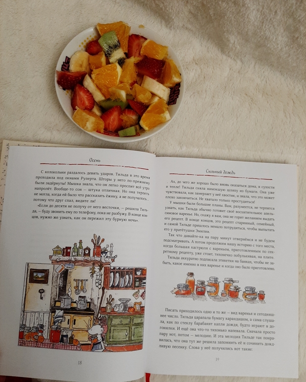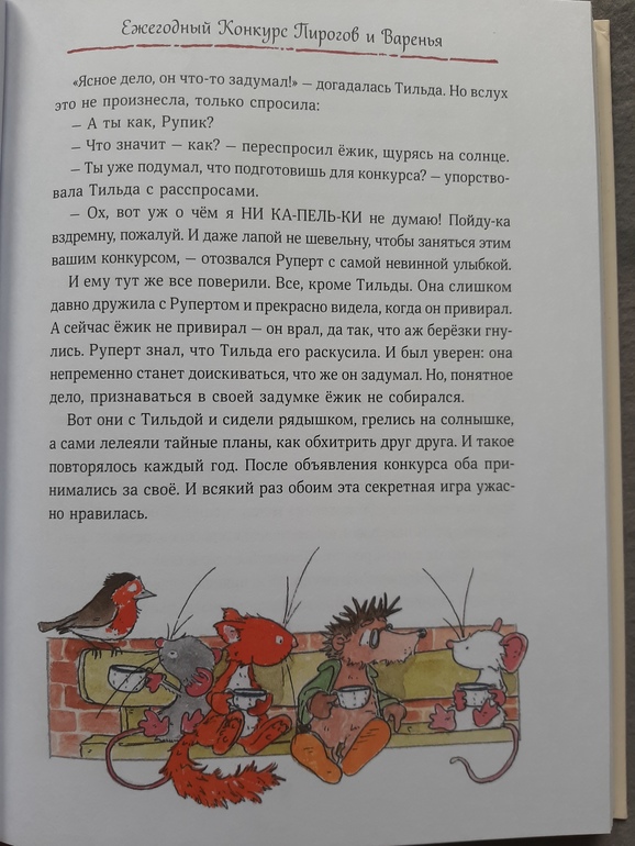 Да, мы тоже попали под обаяние белой церковной мышки Тильды и ее друзей из переулка, где растет шиповник! Могу честно сказать, книжку брала на свой страх и риск, не была уверена в успехе, мне книжка представлялась таким уютным, спокойным, медативным чтением, неспешное, под кружечку чая с апельсиновым вареньем, или хотя бы с апельсиновым салатом)