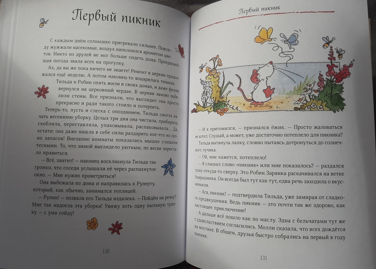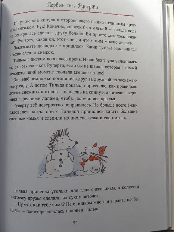Ну и главный, конечно, показатель того, что книга полюбилась и запала в душу, это то, что герои прижились в играх, то машинку сын строит для Тильды и ежика Руперта, то устаивает им чаепитие) Чудесная во всех смыслах книга! И издана тоже чудесно) белоснежные листочки, прелестные рисунки, очаровательный цветочный принт на корешке и действительно необходимая при таком объеме красная закладочка) Жаль только, очень мало рассказов про зимние приключения, так что очень надеемся на продолжение!