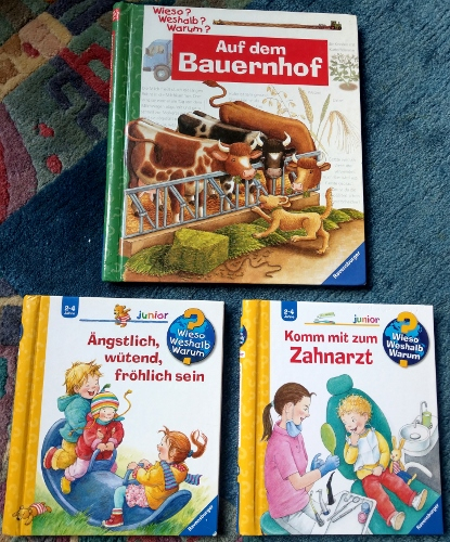 И напоследок книги, которые активно набирают популярность у сына (и их становится дома все больше), это немецкая "классика" Wieso?Weshalb?Warum?" на разные темы. У нас их уже 4 (одна лежит еще не открытая про времена года). Недавно купили вот про зубного врача, готовимся к посещению его вживую😅