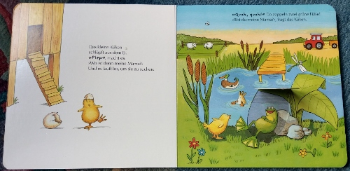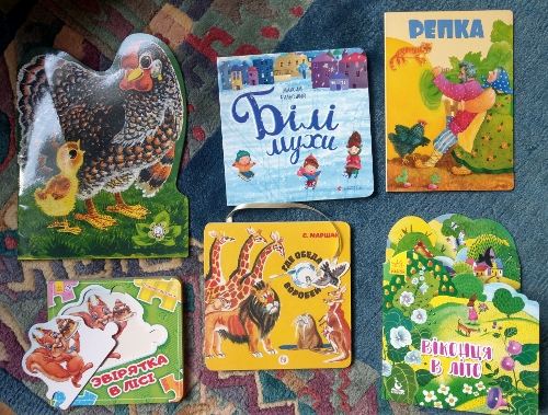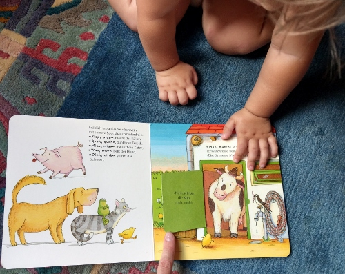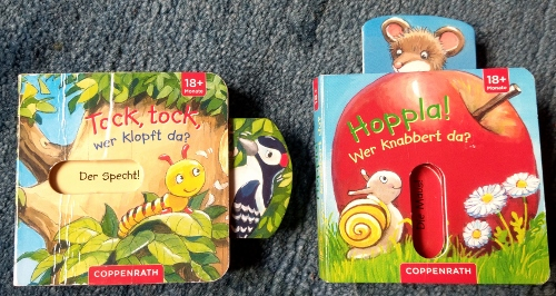 Самой популярной в эти полгода оказалась "Ты моя мама?" на немецком. Удобный формат, приятная расцветка, окошки. Сын носил и носил (и все еще носит) ее "титать".