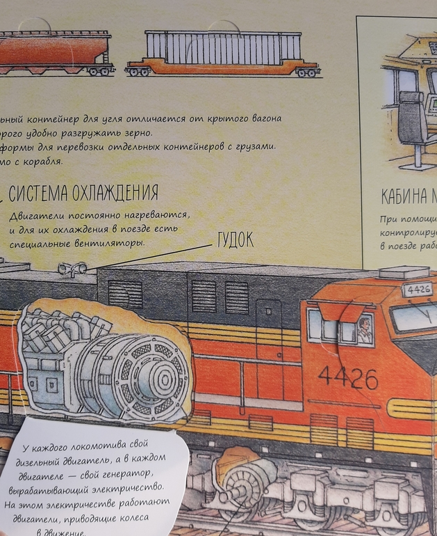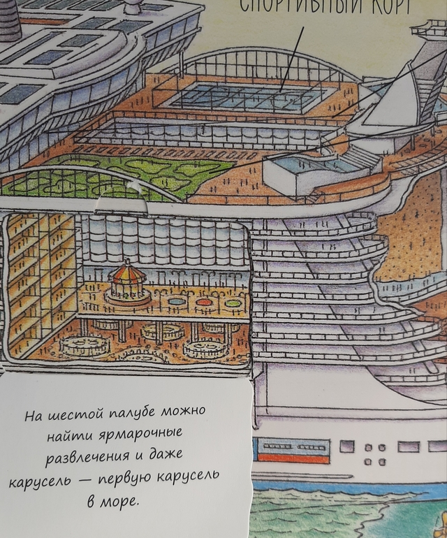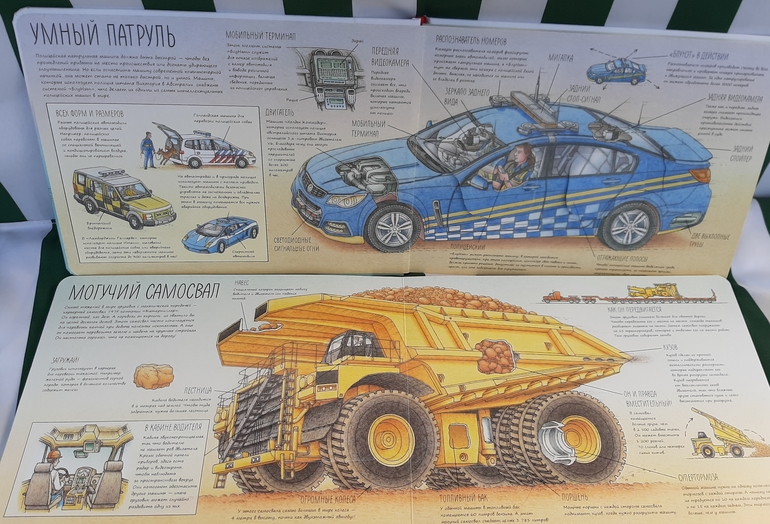 так как на даче ему иногда читают другие дети, дочка или племянница, то девчонки тоже теперь в курсе, как перевозят самосвал с места на место, сколько литров помещается в его топливный бак и зачем отражающие полосы полицейским машинам) мне в этих книгах нравятся, что информация подана не в виде сухих фактов, а достаточно образно. Например, что в самосвал вмещается 1200 роялей или 70 слонов, а один из 6 двигателей громадного корабля Оазис морей сжигает столько же топлива, как 86 автомобилей!