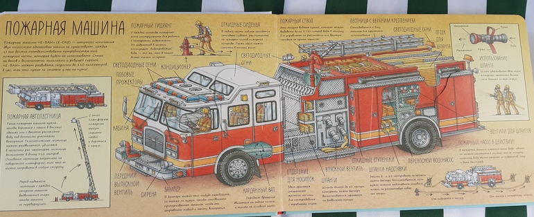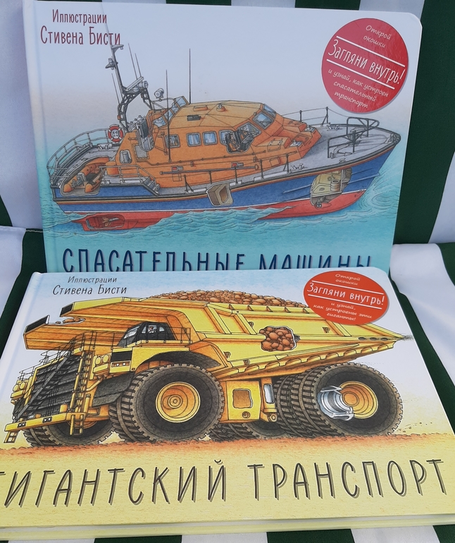 Две энциклопедии с окошками с рисунками С. Бисти! Отличные подробные рисунки самого различного транспорта не оставят равнодушными ни одного мальчишку, моего, по крайней мере, не оставили точно) очень любит их рассматривать и открывать окошки! И если раньше читать было не обязательно, то теперь он именно слушает, открывает по очереди каждое окошко и спрашивает А тут ты прочитала?) Спасательные машины у нас давно, и очень уважаемы сыном, особенно разворот с пожарной машиной долго был в фаворитах