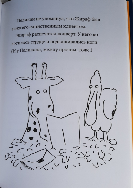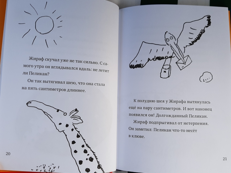 Вернее, сначала то я думала ее пропустить, но увидев, что одно из действующих лиц пеликан, тут же схватила) Книжка небольшого размера, с черно- белыми рисунками. Однажды Жирафу стало скучно, одному, без друзей, и он решил написать письмо первому встречному туда, где заканчивается горизонт