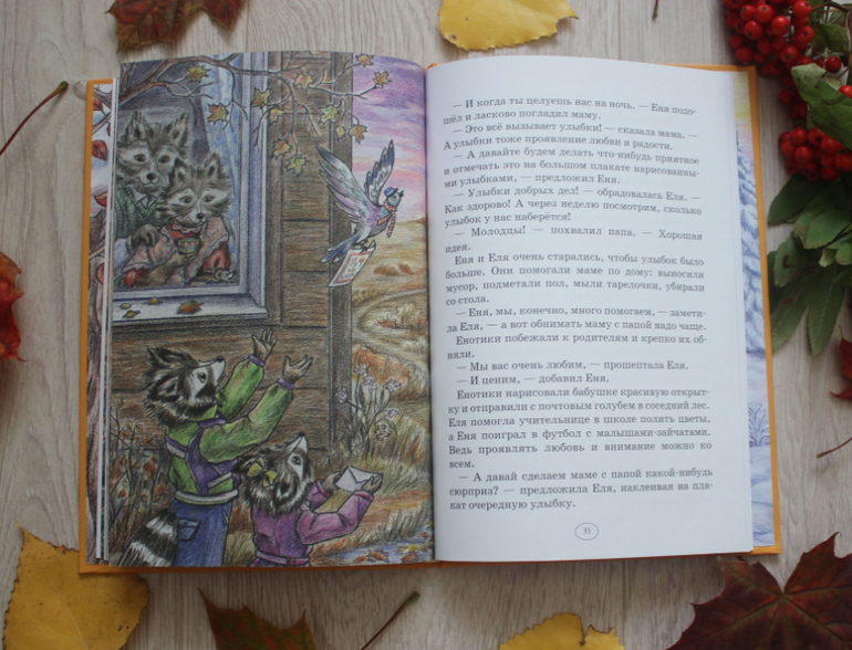 Наша первая осенняя книга: "Еня и Еля . Осенние истории" Анна Гончарова. В нашей домашней библиотеке достаточно много книг про этих енотиков. Книга небольшого формата, иллюстрации очень красивые, атмосферные. Сами истории добрые, поучительные, повествование неспешное. Эти сказки прекрасно подойдут для чтения перед сном.