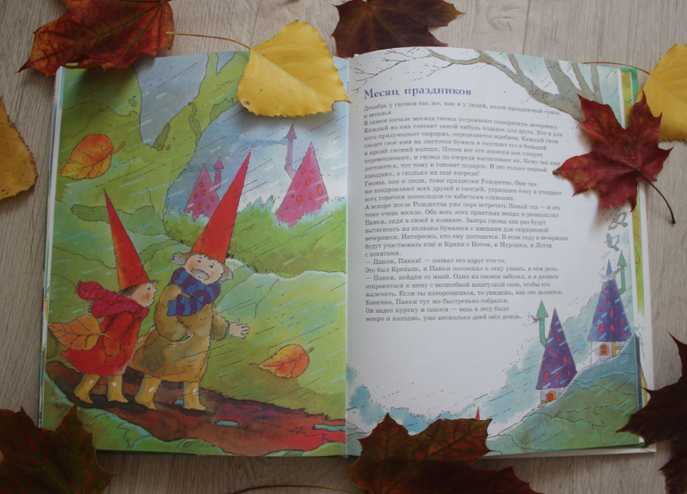 Следующая книга, про которую хочу рассказать: "301 история о веселых гномах" Элин Херман. Повествование разбито на небольшие части, которые связаны между собой по смыслу. Эту книгу я купила совершенно случайно в фикс-прайсе. Мы взяли ее с собой в долгую дорогу для чтения ребенку, и неожиданно она превзошла мои ожидания. Истории о гномах добрые, интересные, рисунки приятные. Дочке очень понравилась сказка, уже несколько раз ее перечитывали. Часть историй происходит осенью.