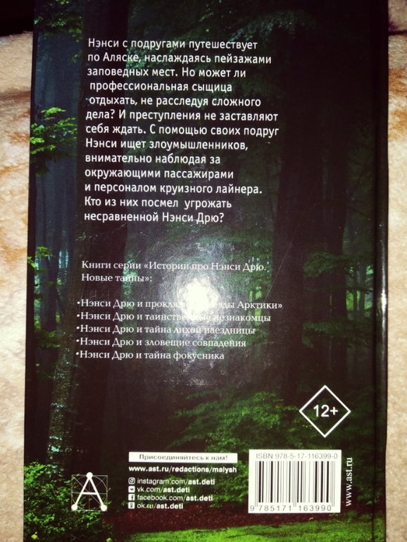 Ненси Дрю работает под прикрытием. Её пригласили в круиз на Аляску для расследования череды преступлений. Девушка намечает круг подозреваемых, кого-то исключая, кого-то добавляя. При этом я постоянно путалась в именах персонажей. И угадать преступника-контрабандиста не смогла. Когда имя его прозвучало, полезла в начало книги, освежить в памяти кто это такой)) А вот парень подруги с самого начала был подозрительным. И не зря)