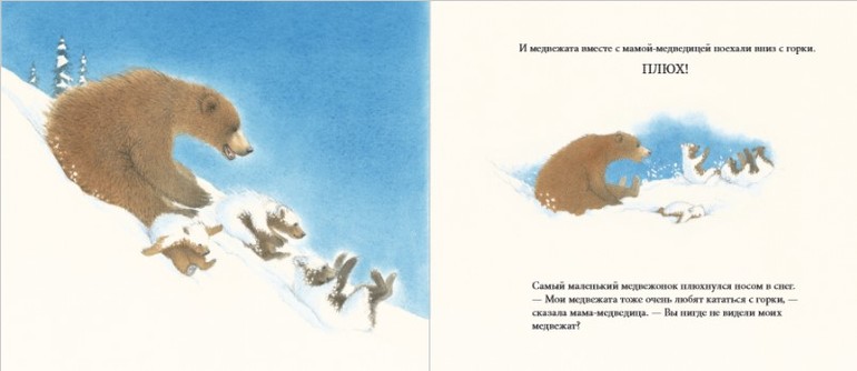 Мама-медведица выходит на улицу, чтобы поиграть со своими медвежатами. Она видит, что медвежата вывалялись в снегу, и их шубки стали совсем белыми. Так начинается увлекательная игра в снежных медведей…