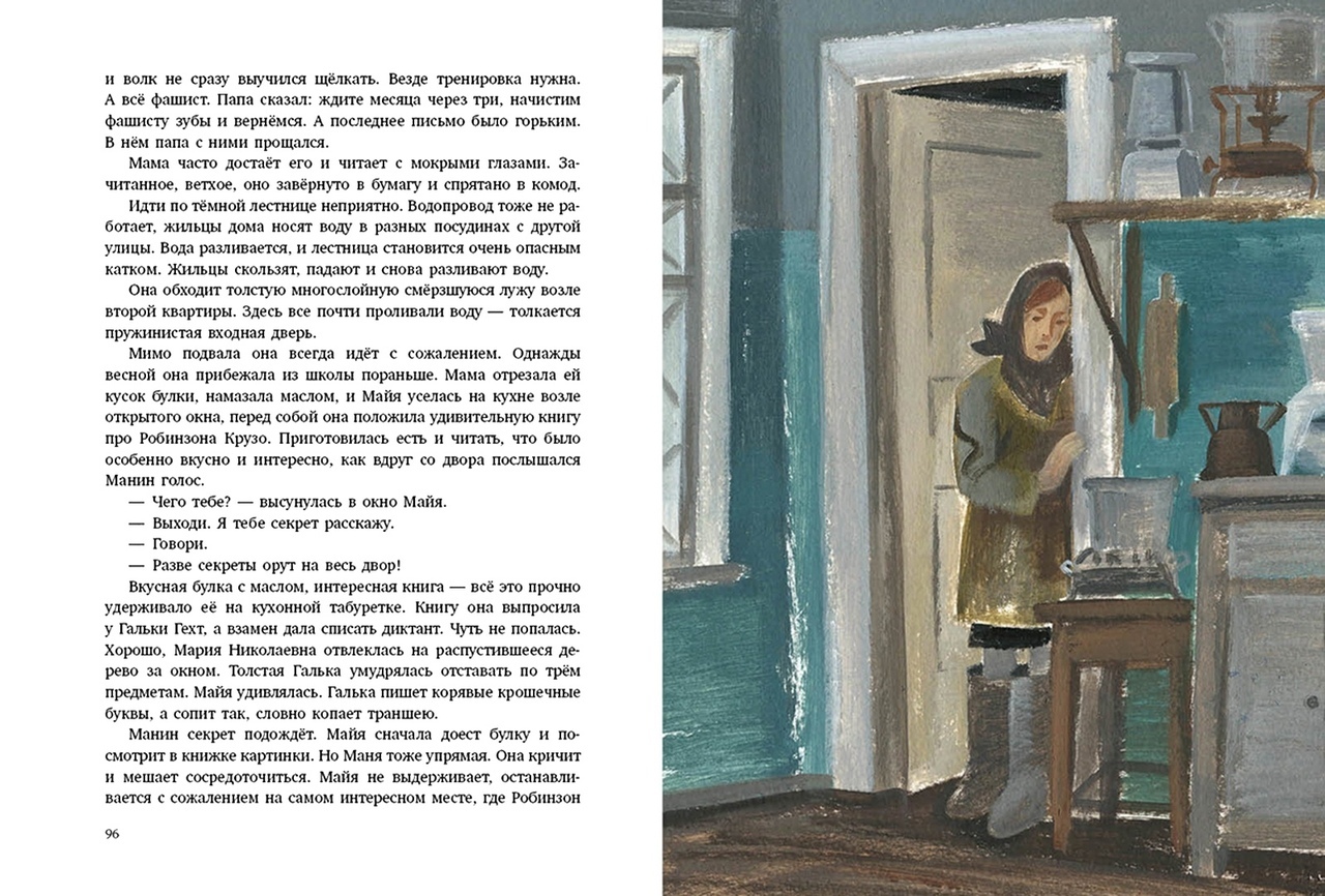 Иллюстрации Лизы Бухаловой соединяют блокадную реальность Майи с её мечтами о мирной жизни и дают надежду, что самые тяжёлые испытания пройдут, уступив место детству.