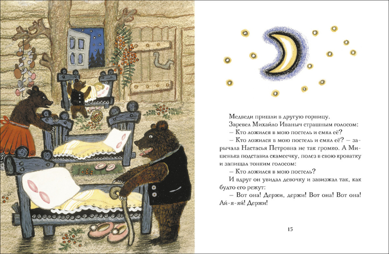 Чудесные иллюстрации Юрия Васнецова - крупные, но с привлекательными деталями: вот Мишутка, чтобы не потеряться в лесу, ухватился за завязки передника Настасьи Петровны; вот Маша лихо раскачалась на Мишенькином стульчике, а из лукошка выпадают грибы. Миски расписные, ложки резные, у каждой кровати по половичку и даже тапочки с помпонами. И гроздья рябины со связками грибов развешаны по медвежьему дому - видимо запасы к холодам.