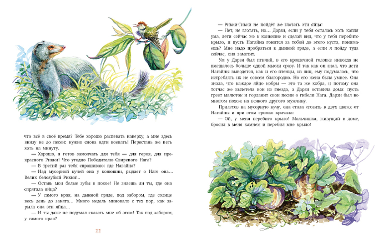 Это сказка о великой войне, которую вел совсем ещё молодой мангуст Рикки-Тикки-Тави с двумя кобрами Нагом и Нагайной. Дарзи, птица-портной, помогала ему, а Чучундра, мускусная крыса - давала ему советы. Но по-настоящему воевал он один. Рикки-Тикки-Тави во время наводнения вынесло потоком реки на берег, где его нашел мальчик Тедди. Мальчик и его родители взяли мангуста в дом, и он стал лучшим другом и защитником людей от кобр. Известно, что где поселился мангуст кобрам не место! Рикки-Тикки-Тави хорошо понимал, что мангусты для того и существуют на свете, чтобы сражаться со змеями и побеждать их!