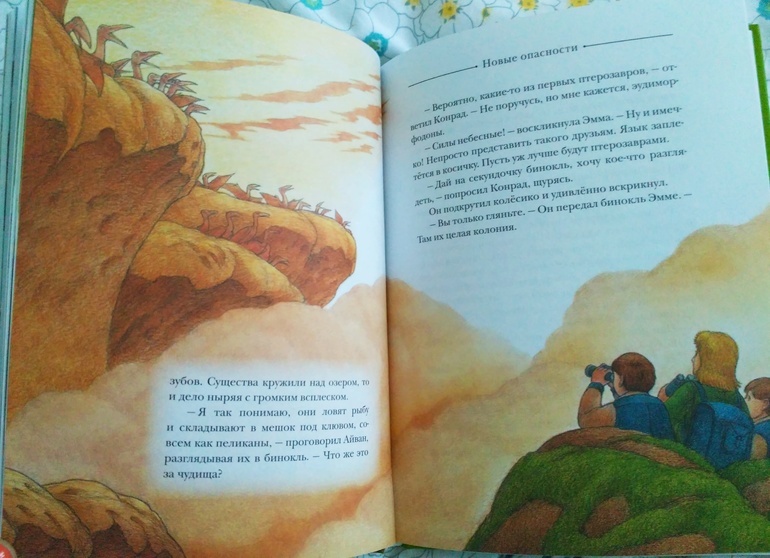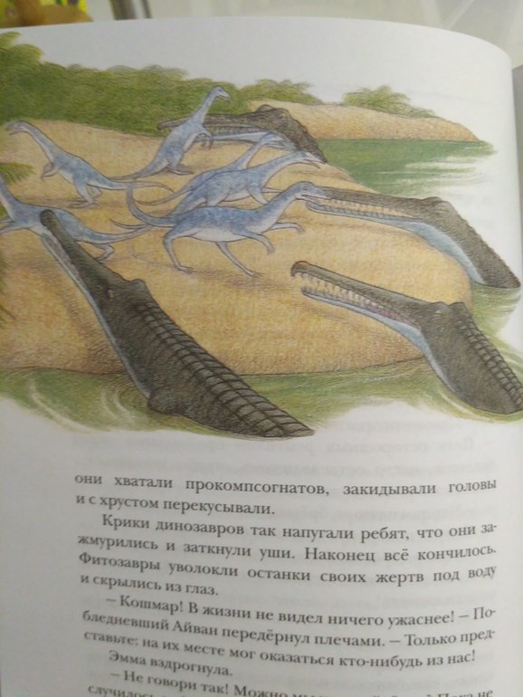 Познавательные книги Аня совсем не хочет читать, возник как то у нее вопрос про динозавров, видимо в школе слышала , ну и дома я предложила открыть книгу по динозаврам , благо это имеется, и Заодно почитать про них художественную книгу "Путешествие к динозаврам " Джерард Даррел . Весной мы читали и не дочитали "Летающий дом", я уже писала что не понравилось, сюжет примитивный , то ли сам текст то ли перевод очень скудный, корявый.. сами факты о животных интересные, но общее впечатление не очень. Про динозавров немного лучше в целом,более плавный сюжет, а не прилетели - поговорили - улетели. Все достаточно плавно развивается, есть место опасностям, познавательным прогулкам и беседам с динозаврами. Понравилось как дети издалека смотрели за жизнью разных динозавров. Вот фитозавры подплыли незаметно к прокомпсогнатам , которые спокойно пили из реки и напали на них.