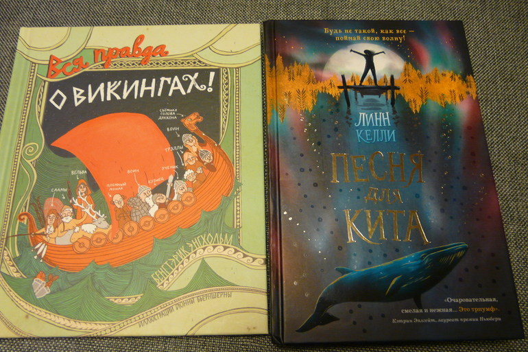 "Песня для кита" ...заинтересовала книга ,для кого купила не знаю,скорее для себя ,Лене это очень не скоро. Подойдет думаю детям от 8-10 лет ." Вся правда о Викингах" пока успела только просмотреть,смутили черно-белые иллюстрации