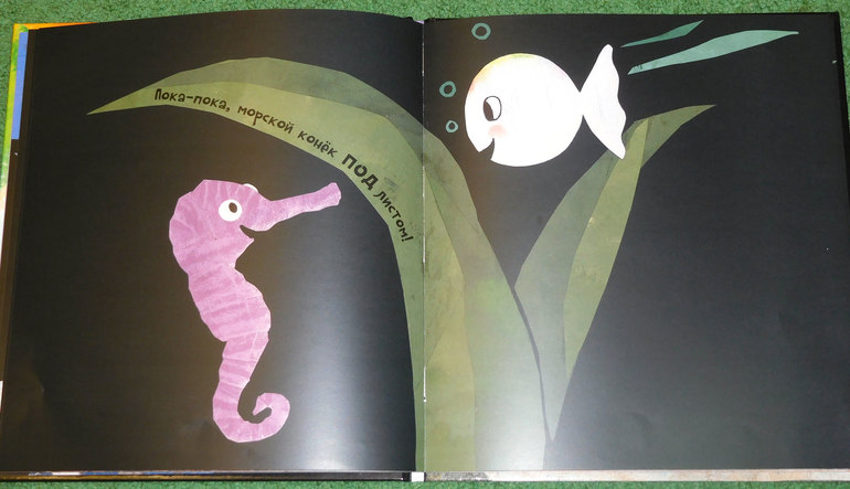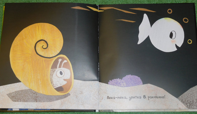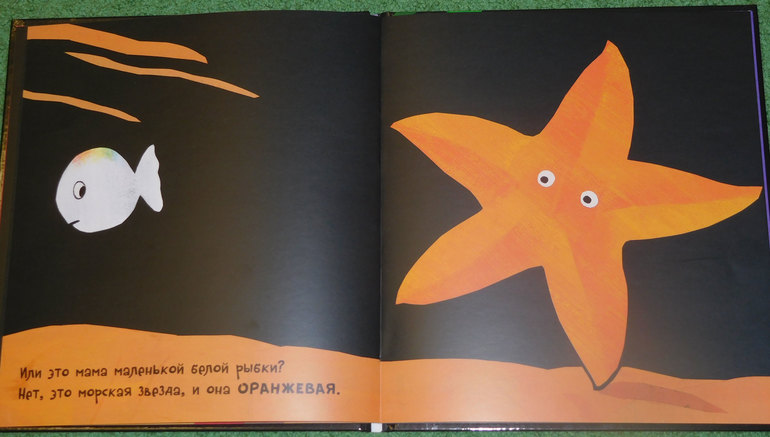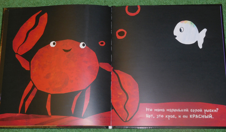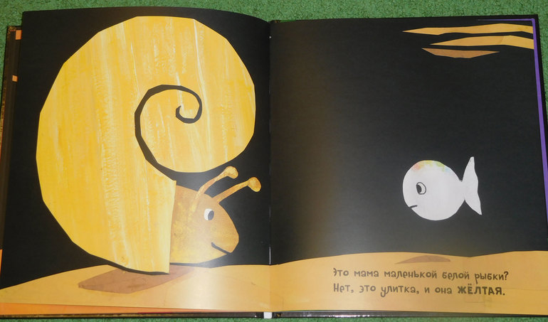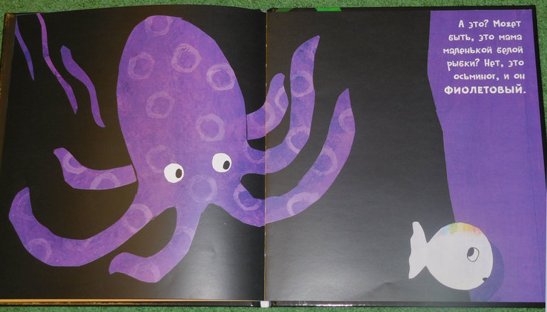 Пусть вас не смущает чёрный фон иллюстраций. Для подобного издания это достоинство, а не недостаток. Книга не смотрится мрачной. Напротив, цветные персонажи делают её очень яркой. Но в чем же "плюс"?.. Дело в том, что чёрный цвет наиболее контрастен ко всему, что малыш видит: к обоям на стенах, к ярким игрушкам, к цвету кожи родителей. Чёрный цвет делает рисунки максимально заметными, чёрная книга привлекает внимание, интересует, цепляет взгляд. Ребёнку хочется исследовать такую книгу, он стукнет по ней ручкой - оказывается, его пальчики и книга очень сильно отличаются по цвету... И рыбка сделана белой тоже не случайно! Белое на чёрном - максимальный контраст; то, что нужно для малыша, который осваивается в большом незнакомом мире.