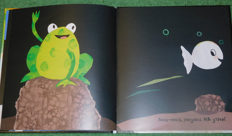 История, рассказанная во второй книжке, ассоциируется у меня с детским садиком, хотя про него там нет ни единого слова. Судите сами: за маленькой белой рыбкой пришла мама, и рыбка начинает прощаться с друзьями. Предложения построены таким образом, чтобы ребенок познакомился с предлогами: