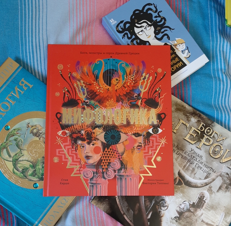 Огромный формат, рефленная обложка, золотые буквы, это всё Мифологика , Боги, монстры и герои Древней Греции, автор Стив Кершо, иллюстрации Виктории Топпинг. И таких героев и богов Вы никогда не видели!)